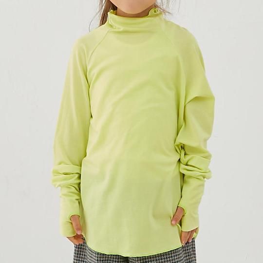 肌触りが良く、衿元のワンポイントとしても活躍するボトルネックの長袖Tシャツ