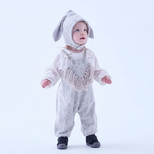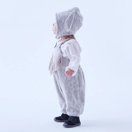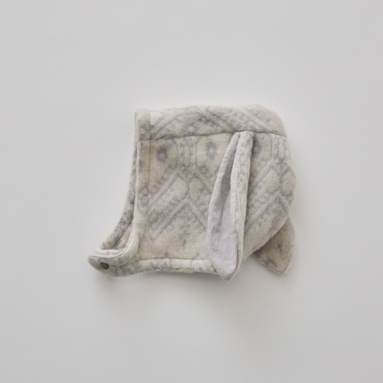 ウサギ耳のボネットは表裏ともにニットジャガードでとっても暖かくベビーウサギになれるかわいい1枚。中綿入りのマフラーは片側を穴に差し込むだけの簡単脱着で、とっても肌触りがよく暖かいのできっと手放せなくなります。