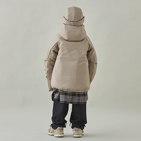 コロンとしたシルエットで、スッキリとしたややスポーティーなデザインは動きやすく、高めのフードや、絞られた裾、ミトンの仕様で、暖かさを逃がしません