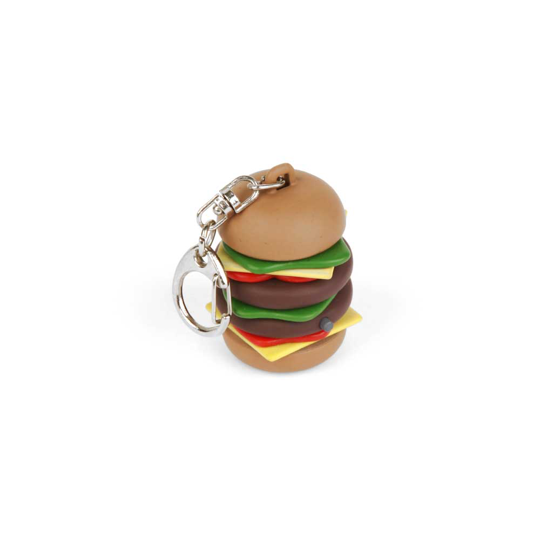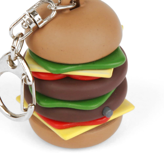 ボタンを押すと満腹そうなゲップの音が鳴る、 思わずかぶりつきたくなるダブルパティのハンバーガーキーリング。