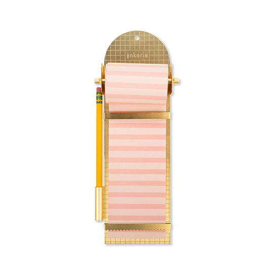 マグネットが付いたゴールドカラーのフレームに、ベイビーピンクのボーダーのロールメモを組み合わせました。ロールメモを引き出して下部の刃でカットするタイプ。サイドにはペンホルダーも付いているので、オフィスやキッチンにぴったりです。